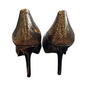 3.5” Heel. One Heel has a bit of wear on the footbed. Excellent pre owned condition.
