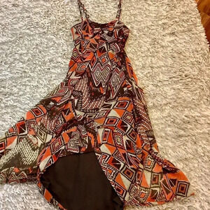 Stunning no zip slip overhead, front pleated, sheer orange, brown & beige exotic print outer layer and fully lined with solid brown underlayer/dress. Small ruffle front. Spaghetti strap with tortoise shell round decorative front connectors/embellishment. EXCELLENT condition, gently loved. Received so many compliments when I wore this! Size 8