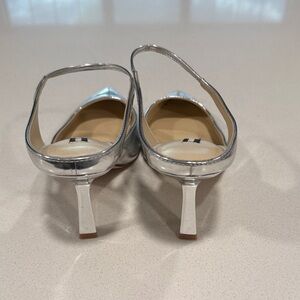 Chic metallic silver heels by Nine West. Sleek design with pointed toe. Ideal for elevating any look.