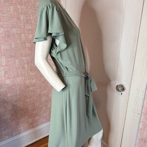Great business casual knee length dress. Features wrap neckline, matching fabric tie belt & short ruffle sleeves. Material has some stretch for fit comfort.