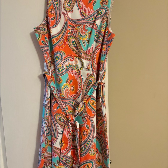 Chic midi dress with vibrant paisley patterns. Features a sleeveless design and tie waist. Ideal for a stylish look.