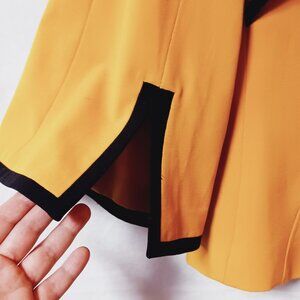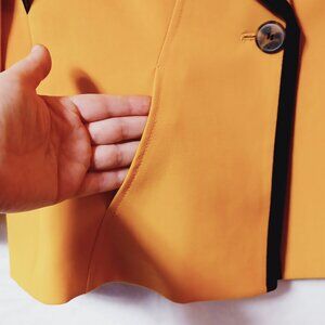 Chic Nine West jacket with pockets. Turn heads with this stylish and sophisticated jacket! Featuring a vibrant mustard yellow color with bold black trim, this statement piece is perfect for layering in spring or fall. The cropped cut and flared 3/4 sleeves add a modern twist to a classic silhouette.