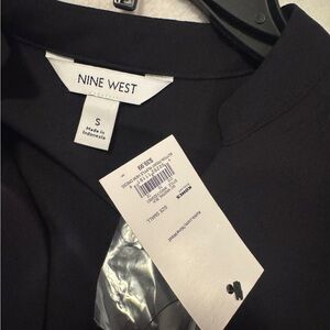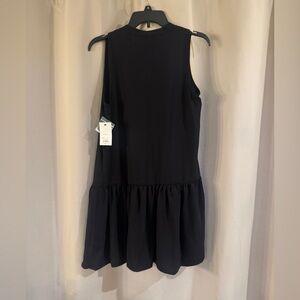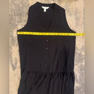 Chic black sleeveless dress with button-down front. Features a stylish drop waist design.