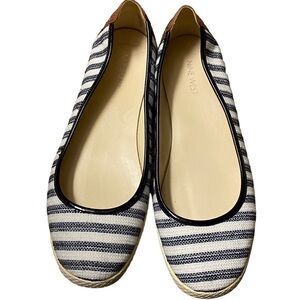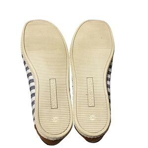 New condition! Navy and White stripes with leather embellishments at the heel. No box