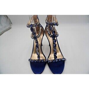 Pre-owned without tag or box Nine West Navy Blue Satin Crystal Embellished Ankle Strap Evening Stiletto 9.5M. Elevate your evening wear with these stunning Nine West evening sandals. Crafted with a luxurious navy blue satin upper, these open-toe stiletto heels feature dazzling crystal embellishments along the straps, adding a touch of glamour and sophistication. The secure ankle strap closure ensures a comfortable and stable fit for any special occasion, from weddings and proms to formal parties. Step into elegance and make a statement with these eye-catching and chic heeled sandals.