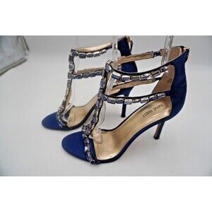 Nine West Navy Blue Satin Crystal Embellished Ankle Strap Evening Stiletto 9.5M