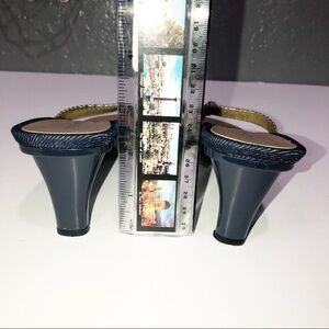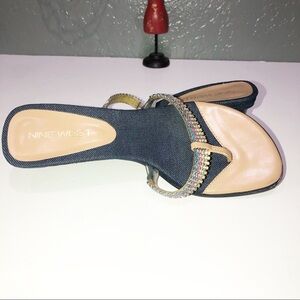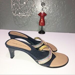 Nine West (Necessary) rhinestone and denim sandal: features multi-color rhinestone thong with a denim and tan footbed. Size listed as 5.5 or 23.5 cm. Used but in great shape.