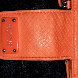 Neon orange pre-loved Nine West micro bag. As this is pre-loved, it has some darker stains on the bottom and sides of the bag (PLEASE CHECK PHOTOS) and light scuffing on the fold over as well. This features an ID pocket on the back exterior of the bag and a single zipper closed pocket in between two other sections that are open. Single snap closure. Silver chain detailing and long orange strap.