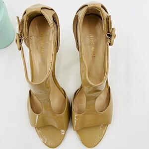 Nine West Nude Patent Leather T Strap Peep Toe Heels Sandals Size 8.5