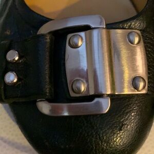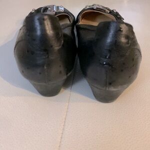 Black flats with silver buckle on toe, very slight wedge heel, some wear on inside of right shoe-see last photo, still have lots of wear left to them