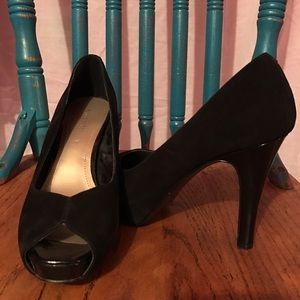 Nine West opened toed heels. Velvet/suede type of material. They have been worn but very few times and not for very long.