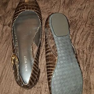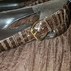 Dark brown size 8 1/2 shoe. Gold buckle. Great with gold accessories