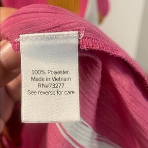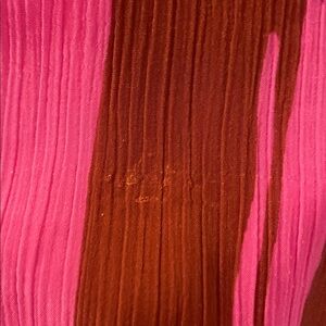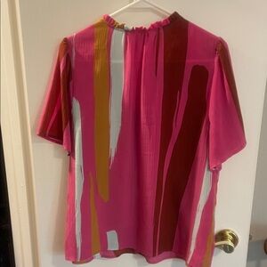 Vibrant pink blouse with bold multicolor stripes. Features a stylish design. Had a small imperfection pictured in photos.