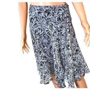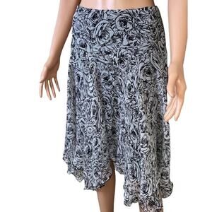 Floral skirt, black and white print, asymmetrical hem, flowy skirt, knee length, lightweight fabric, boho chic, casual wear, summer skirt, A-line silhouette, women’s fashion, plus size clothing, versatile outfit, office casual, everyday style