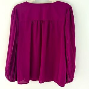 This elegant Nine West blouse features a pleated front and buttoned design, crafted in a beautiful deep pink/purple hue. The flowy fabric and billowy sleeves offer a comfortable yet stylish fit, perfect for any occasion.