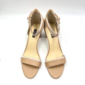 Nine West women's Pruce beige / tan / nude / natural leather open toe block heels.