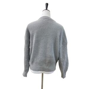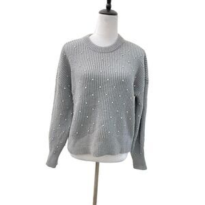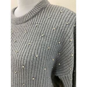 Nine West Pull Sweater Smocked Grey Knit Crystal Embellishments Crew Size L
