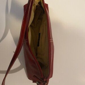 Dark (deep) Red Nine West purse. Approximately 11 inches in length and 4 inches high. Small zippered pocket on the inside. Made of PVC.