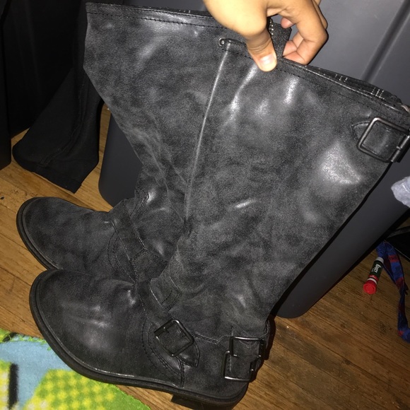 Acid wash black riding Boot with longer zipper in the back. Calf length