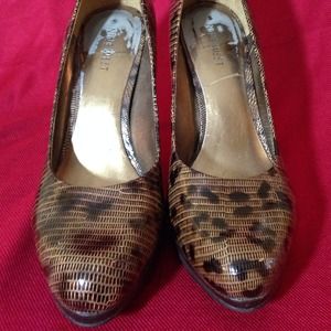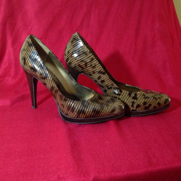 Beautiful pump by Nine West. 1/2 size too small for me so I only wore them twice :-(. The only sign of wear in in the footbed inside (the metallic top layer easily wears off). 4 1/2 " heel but has a 3/4-1" platform (half of the platform is hidden). Leather upper. I love these shoes and I hope you will too!