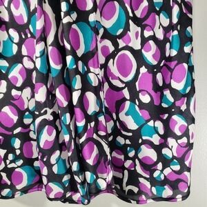 Features : purple & blue geometric print, black background, sleeveless, satin material, self tie neck, high neck, keyhole front, ruched at back collar, professional, office wear, chic, business