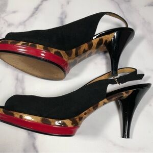 Adjustable Slingback with Peep-Toe. Black Nubuck Leather upper topping off a red and leopard print bottom Slingback. Leopard heel and black/tan bottom of the shoe. 2 inch heel and cushioned foot bed.