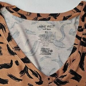 Nine West Shirt Womens XL Tan Black Abstract Print Soft Spun Short Sleeve V Neck Top