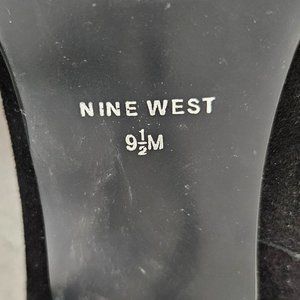 Elegant Nine West black suede heels for women, size 9.5M. Slip-on design with an open toe and pleated detail, perfect for dressy occasions.