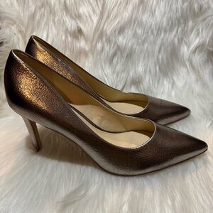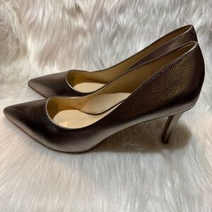 These Nine West heels feature a sleek pointed-toe design in a stunning silver color, perfect for adding a touch of sophistication to any formal occasion. The medium-height heel and streamlined silhouette offer both style and comfort, while the metallic finish provides a chic, modern look.