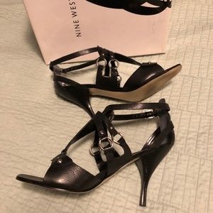 These are a pre-owned pair of Nine West Size 9 Wide Width Black Leather High Heels.