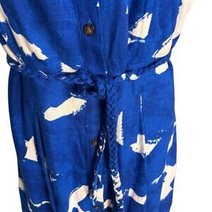 The Nine West Size Small Flutter Sleeve Button Front Godet Dress in Santorini Blue is a stylish and versatile dress perfect for various occasions such as parties, casual outings, and business meetings. Made from a blend of polyester, rayon, and linen, this dress features a geometric pattern, V-neckline, short flutter sleeves, and a button closure. The fit & flare style and short length make it ideal for the summer, fall, and spring seasons. Machine washable and lined for added comfort, this dress is a must-have for any fashion-forward woman's wardrobe.