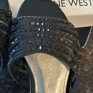 Nine West Slides Sandals 5 glass and textile upper, silver bed, Flat black