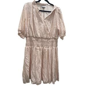 This feminine peasant dress by Nine West features a smocked waist and a v-neckline with optional pearlescent button clasp, complemented by short puff sleeves. The dress showcases a beautiful blend of off-white and pink with a very subtle abstract pattern. Nice material. Good used condition. Due to its stretch could fit XL or 1X as well.