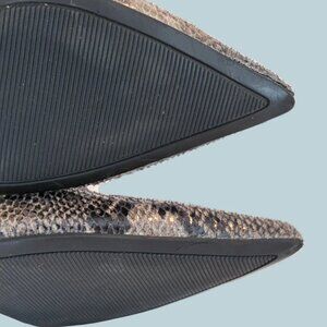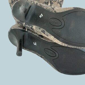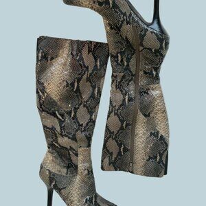 Discover these stylish boots from the renowned brand Nine West. They showcase a striking snake skin print that adds a unique flair to any outfit. With a mid-calf height and a pointed toe, these boots are both fashionable and versatile.