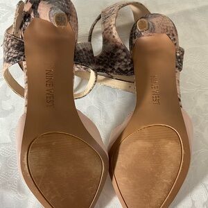 The product is a pair of Nine West snakeskin nude heels in women's size 5. These cream-colored pumps feature an open toe design and are made of leather. The elegant style and brand reputation make these heels a stylish and high-quality addition to any woman's shoe collection. Perfect for adding a touch of sophistication to any outfit, these pumps are sure to make a statement.