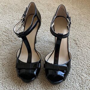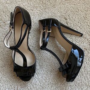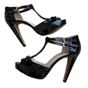 Nine West Strappy Bow Heels Prom Stiletto Sandals T Strap Sexy Black Patent