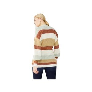 Nine West Striped Plus Size Multi Colored Belted Balloon Sleeve Sweater colors are mint, nutmeg, cream & beige sweater, cardigan, open front, long balloon sleeves, tie, waist, line, multicolored, stripe, drop sleeves size XXL