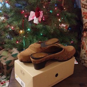 Nine West "Kaceyr" dark brown "tobacco" Suede Clogs size women's 9.5. Used. Heels have wear, balls of foot look great. Printed logo in footbed worn. But otherwise in great condition.