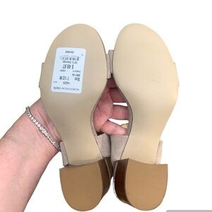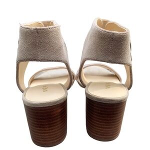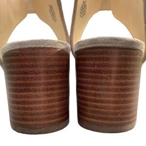 Nine West Suede Sandals 7.5 Stacked Heel Gold Hardware Strappy Neutral