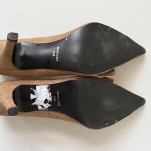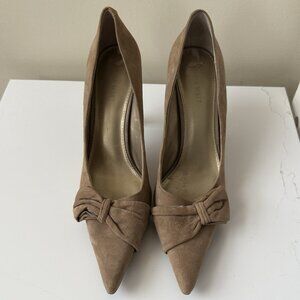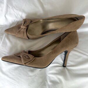 Nine West Suede Stiletto Pumps Heels Tan Brown Slip On Pointed Toe Bow
