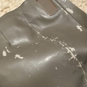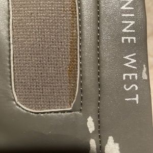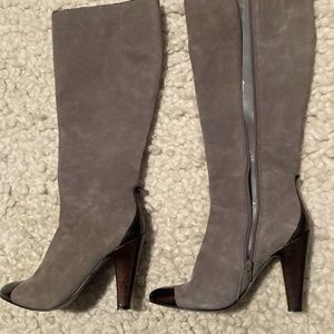 Nine West taupe high heeled 19 inch (bottom of sole to top) boot with shiny heel and toe in brown metallic. Worn once inside. Pristine suede outer, some deterioration of leather liner. Size 7M.