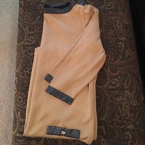 Great for work! Camel color with black and metallic accents. 3/4 sleeve. Very flattering. Only worn a few times, can be machine washed.