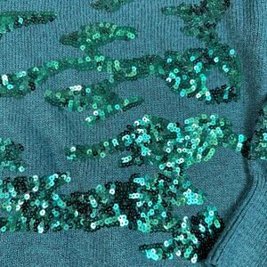 The Nine West Sweater in green is designed for women in size M. This ribbed knit sweater features sequins, balloon sleeves, and a crew neck, offering a stylish and festive fit for casual or dressier occasions.