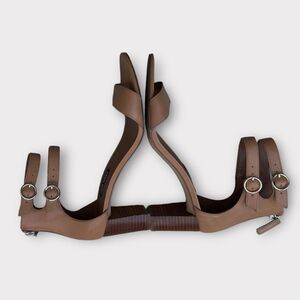 Gently worn Nine West tan leather sandals, women’s size 9.5. Feature a stylish double ankle strap, block heel, and sleek minimalist design that pairs beautifully with dresses or tailored pants. Elegant yet comfortable — perfect for work, events, or everyday sophistication.