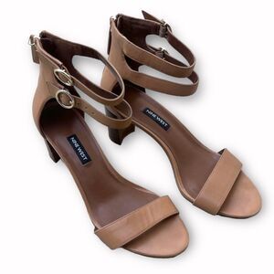 Nine West Tan Leather Sandals Women Sz 9.5 Double Ankle Strap Block Heel Elegant