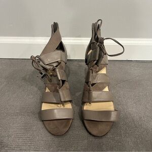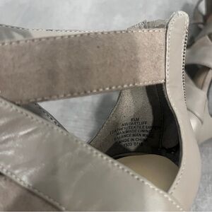 These tan sandals feature a stylish strappy design with a comfortable 2.5 inch heel, perfect for adding a touch of elegance to any outfit. The intricate caged effect created by the thin straps offers a chic look, while the suede-like material provides a soft, matte finish. An adjustable ankle strap ensures a secure fit for all-day wear.