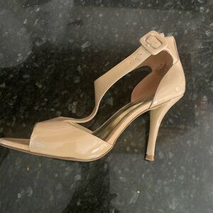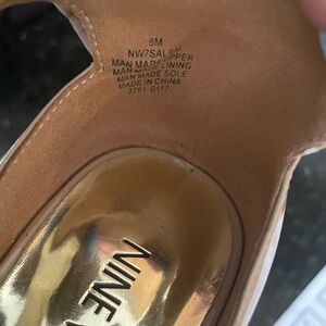Step into elegance with Nine West's tan block heel heels, crafted from a suede-like material for a soft, matte finish. These heels feature a wide toe strap and an adjustable ankle strap for a secure fit, while the metallic insole adds a hint of glamour. Perfect for any occasion, they combine style and stability with their chunky heel design.