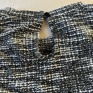 Stylish tweed textured blouse with a classic black and white pattern. Features puff sleeves and peplum silhouette for a modern look. Size Large. Excellent used condition.