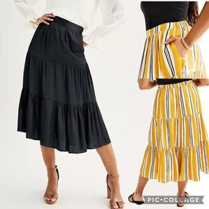 Keywords/Tags: boho chic, flowy skirt, tiered midi, feminine silhouette, elevated basics, summer essentials, date night outfit, office to evening, romantic style, soft texture, casual elegance, weekend style, minimalist fashion, classic black, resort wear, modest fashion, breathable fabric, dance-ready skirt, modern bohemian, graceful movement, day-to-night transition, polished casual, effortless chic