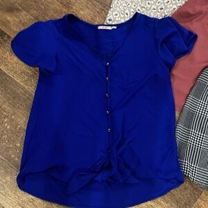 The royal blue top is by the brand Mi Ami and is also 100% polyester with gorgeous button buttons down the middle and a tie at the waist, featuring ruffle sleeves
